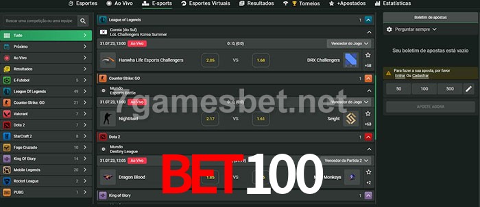 O Bet100 oferece uma grande seleção de opções de apostas em e-sports com probabilidades competitivas